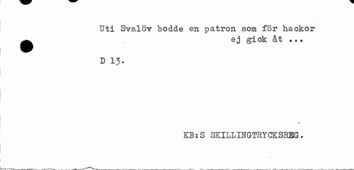 //// Uti Svalöv bodde en patron som för hackor ^ ej gick åt ?.? //// D 13. //// KB:S SKILLINGTRYCKSBEG. ////