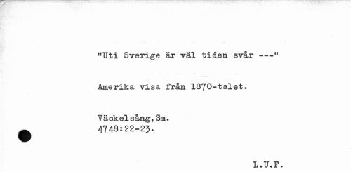 //// "Uti Sverige är väl tiden svår---11 //// Amerika visa från 1870-talet. //// Väckelsång,Sm. //// •4748:22-23. //// i //// L.U.P. ////