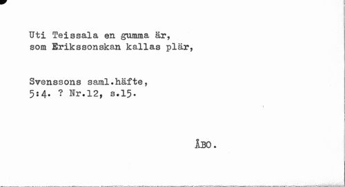 //// Uti Teissala en gumma är, som Erikssonskan kallas plär, //// Svenssons saml.häfte, //// 5:4. ? Nr.12, s.15. //// ¦ 1 //// 1 //// j //// ÅBO. ////