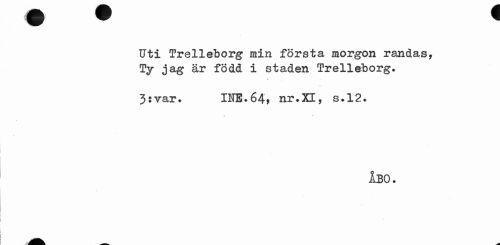 //// Uti Trelleborg min första morgon randas, Ty jag är född i staden Trelleborg. //// \ //// 3svar. INE.64, nr.XI, s.12. //// ÅBO. ////