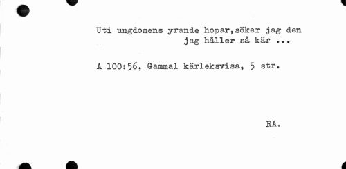 //// Uti ungdomens yrande hopar, söker jag den //// jag håller så kär ••• //// A 100:56* Gammal kärleksrisa, 5 str* //// RA, ////