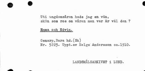 //// Uti ungdomsåren hade jag en vän, //// skön som ros om våren men var är väl den ? //// Emma och Edvin. //// Genarp,Bara hd.(Sk) //// Hr. 5223. Uppt.av Helge' Andersson ca.1910. //// LANDSMÅLSARKIVET i LUND. ////
