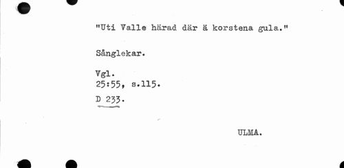 //// "Uti Valle härad där ä korstena gula." Sånglekar. //// Vgl. //// 25:55, s.115. //// D 255. //// / //// ULM A. ////
