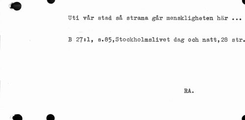 //// Uti vår stad så strama går menskligheten här ? B 27:1, s.85,Stockholmslivet dag och natt,28 str. //// RA. ////