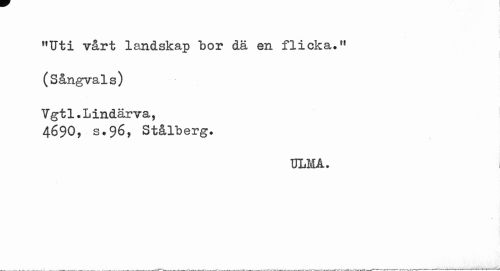 //// "Uti vårt landskap bor dä en flicka.11 //// (Sångvals) //// Tg ti. Lindar va, 4690, s.96, Stålberg. //// ULM A. ////