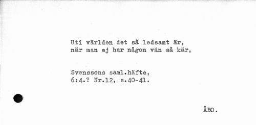 //// Uti världen det så ledsamt är, när man ej har någon vän så kär, //// Svenssons saml.häfte, //// 6:4»? Nr.12, s.40-41• //// ÅBO. ////