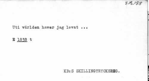 //// Uti världen haver jag levat ... E 1838 t //// KB:S SKILLINGTRYCKSREG. 1 //// , • L ////