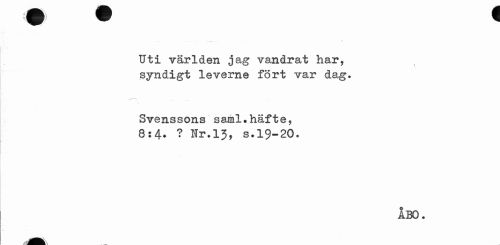//// ... - '* //// Uti världen jag vandrat har, syndigt leverne fört var dag. //// Svenssons saml.häfte, //// 8:4* ? Nr.13, s.19-20. //// ÅBO. //// Rfe. ////