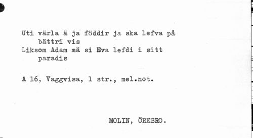 //// f I //// Uti vari a ä ja föddir ja ska lefva på //// bättri vis Liksom Adam mä si Eva lefdi i sitt //// paradis i //// A 16 ? Vaggvisa, 1 str., mel.not. L //// MOLII, ÖREBRO. ////