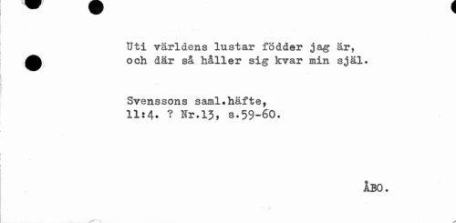 //// Uti världens lustar födder jag är, ^^ och där så håller sig kvar min själ. //// Svenssons saml.häfte, //// 11:4» ? Kr.13, s.59-60. //// ÅBO. //// ^---'N ^ ////