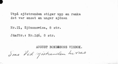 //// Utpå sjöstranden stiger upp en ranka det var ensat en unger sjöman //// Hr. 21, Sjömansvisa, 8 str. Jämför.; Nr.246, 8 str. //// AUGUST BONDESONS VISBOK. ////