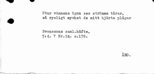 //// Utur vännens ögon ses strömma tårar, ^^ så rysligt mycket de mitt hjärta plågar //// Svenssons saml.häfte, //// 5:4. ? Nr.24. s.178. //// ÅBO. ////