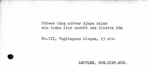 //// - //// Utöver bär g utöver djupa dalar //// min tanke ilar snabbt som blixten hän //// ta . • ' . • . //// Hr.III, Ynglingens klagan, 13 str. //// LEFFLER, MUS.HlST.MUS. ////