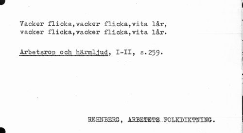//// 9 3 //// i //// Vacker flicka,vacker flicka,vita lår, vacker flicka,vacker flicka,vita lår. //// Arbetsrop och härmljud, I~II, s.259* //// k //// f I- //// v //// REHNBERG, ARBETETS FOLKDIKTNING. j //// k ////