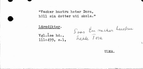 //// "Vacker hustru heter Dora, //// •höll sin dotter uti skola*" //// ) //// Lärodikter. n ti y) //// Vgl.ise hd., . T //// 111:499, s.l, ,(nu- //// \ //// ULMå. ////