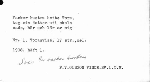 //// I //// I //// Täcker hustru hette Tora, //// 7 i //// tog sin dotter uti skola //// sade, hör och lär av mig //// » //// Hr. 1, Torasvisa, 17 str.,mel. 1908, haft 1. //// P.V.OLSSON VISOR.SV.L.D.M. ////