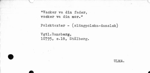 //// "Vacker va din fader, vacker va din mor." //// Polsktexter - (slängpolska-danslek) //// Vgtl.Ransberg, 10795, s.18, Stålberg. //// ^ ULMÅ. //// ^ a ////