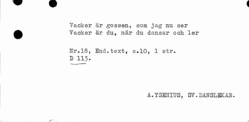 //// Vacker är gossen, som jag nu ser ^^ Vacker är du, när du dansar och ler //// Hr.18, End.text, s»10, 1 str. //// B 113. //// A.YSENIUS, SV. DANSLEKAR. ////