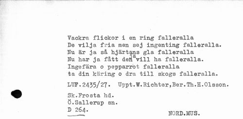 //// i //// Vackra flickor i en ring falleralla //// De vilja fria men sej ingenting falleralla. //// Nu är ja så hjärtans gla falleralla //// Nu har ja fått deå vill ha falleralla. //// Ingefära o pepparrot falleralla //// ta din käring o dra till skogs falleralla. //// LUF. 2435/27. Uppt. Y/.Richter, Ber. Th. H.Olsson. //// ^^ Sk.Frosta hd. //// Ö.Sallerup sn. //// NORD.MUS. ////