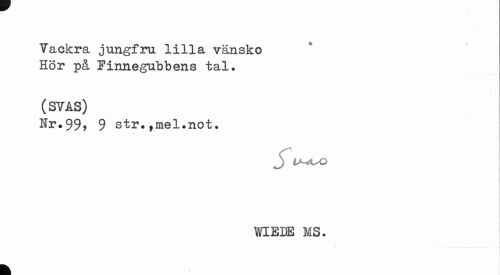 //// Yackra jungfru lilla vänsko Hör på Pinnegubbens tal» //// (SYAS) //// Nr.99? 9 str.,mel.not. //// i //// WIEDE MS. //// 1 ////