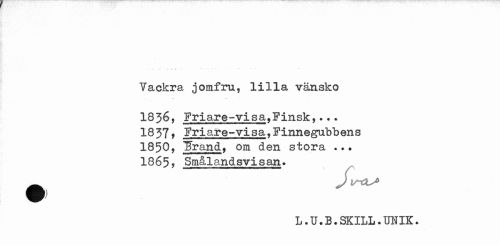 //// Vackra jomfru, lilla vänsko //// V --1 '. . //// 1836, Priare-visa,Finsk,»** 1837f Fri are-vi sa,Finnegubbens 1850, T?rand, om den stora ... //// 1865? Smålandsvi s an ? //// L • U • B • SKILL. UNIK * ////