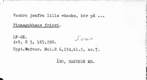 //// Vackra jomfru lilla vänsko, hör på «.• //// i //// Finnegubbens frieri. LF—GrK» //// 4:8, R 3, 165,290. //// Uppt.Wefvar. Mel.R 6,194,bl.2, nr.7. //// ¦ //// ÅBO, RANCKEN MS. //// i //// i i //// i ////