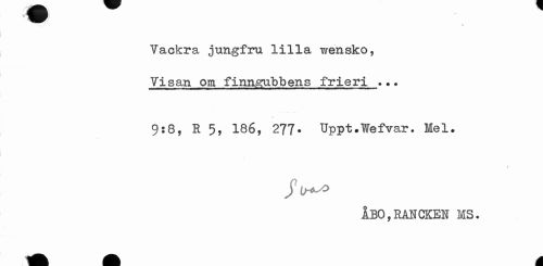 //// Vackra jungfru lilla wensko, Visan om finngubbens frieri *?? //// 9:8, R 5, 186, 277• TJppt.Wefvar. Mel» //// i //// ju^o //// ÅBO,RASCKEH MS. ////