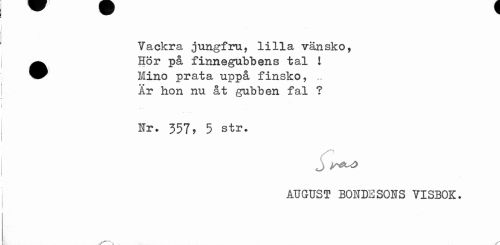 //// Vackra jungfru, lilla vänsko, //// •Hör på finnegubbens tal ! Mino prata uppå finsko, -År hon nu åt gubben fal ? //// Hr. 357? 5 str. //// J //// AUGUST BONDE SOTS VISBOK. ////