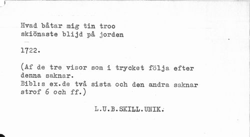 //// / //// Hvad båtar mig tin troo skiönaste blijd på jorden //// * //// 1722. //// (Af de tre visor som i trycket följa efter denna saknar. //// Bibl:s ex.de två sista och den andra saknar strof 6 och ff.) //// L. U. B ?SKILL.UUIK. ////