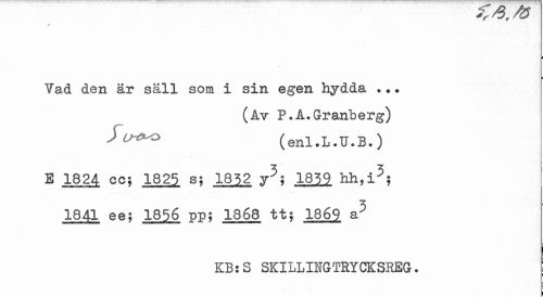 //// i i //// Vad den är säll som i sin egen hydda ... //// (Av P.A.Granberg) (enl.L.U.B.) //// E 1824 cc; 1825 s; 1852 y5; 1859 hh,i5; 1841 ee; 1856 pp; 1868 tt; 1869 a5 //// KB:S SKILLINGTRYCK SREG. ////