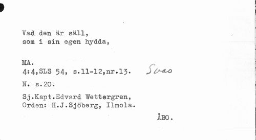 //// * | //// i //// Yad den är säll, som i sin egen hydda, //// MA. //// 4:4,SLS 54, s.11-12,nr.13. J //// N. s.20. //// Sj.Kapt.Edvard Wettergren, Orden: H.J.Sjöberg, Ilmola. //// ÅBO. //// 1 1 ////