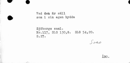//// Yad den är säll ^^ som i sin egen hydda //// Sjöbergs saml. //// Nr.117, SLS 130,8. SLS 54,20. S # * //// S t^o //// ÅBO. ////