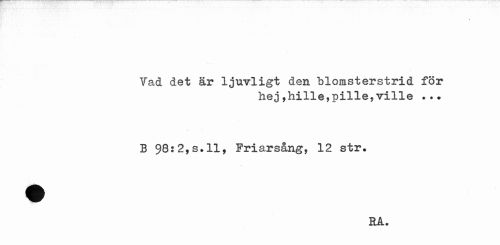 //// "Vad det är ljuvligt den blomsterstrid för //// hej,hille,pille,ville ..? //// B 98:2,s.ll, Friarsång, 12 str. //// RA. ////