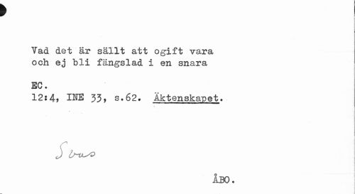 //// f //// Vad det ar sällt att ogift vara och ej bli fängslad i en snara //// EG. //// 12:4? INE 33, s.62. Äktenskapet. //// \ //// J (s-UuSO ; //// ÅBO. ////