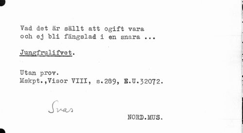 //// I //// Vad det är sällt att ogift vara och ej bli fängslad i en snara ... //// > //// Jungfru1i fve t. //// L //// Utan prov. //// Mskpt.,Visor VIII, s.289, E.U.32072. //// Jyi+éco //// NORD.MUS. //// fe. ////