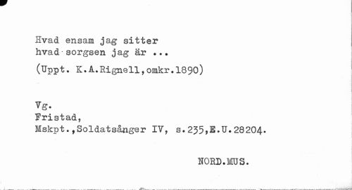 //// Hvad ensam jag sitter hvad sorgsen jag är //// (Uppt. K*A.Rignell,omfcr.l890) //// 1 //// Vg. //// Fristad, //// Mskpt.,Soldatsånger IV, s.235,E.U.28204- //// i //// NORD.MOS. ////