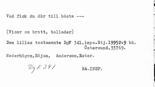 //// I //// i= //// Vad fick du där till bästa---a //// i //// (Visor om brott, ballader) //// Den lillas testamente DgF 341,inps.Rtj.19952:$ bd. //// Östersund,33769. Nederhögen,Rö jan, Anderson,Ester. I: //// ^ /T J y / RÅ.XHSP. ////