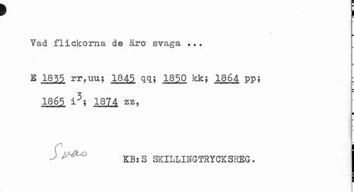 //// 9 ] //// * //// Vad flickorna de äro svaga ... //// E 1835 rr,uu; 1845 qq; 1850 kk} 1864 ppj 1865 i5; 1874 zz, //// i //// KB, B SKILLIHGTSTCKSREG. i ////
