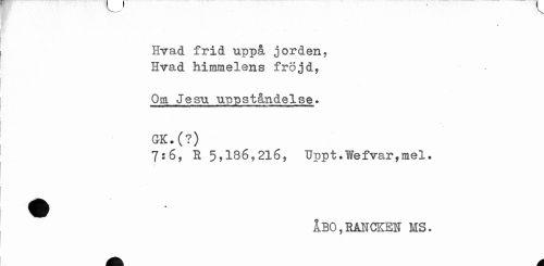 //// t //// Hvad frid uppå jorden. Hvad himmelens fröjd, //// Om Jesu uppståndelse» GK.(?) //// 7:6, R 5,186,216, Uppt.Wefvar,mel. //// ÅBO,RANCKEN MS. ////