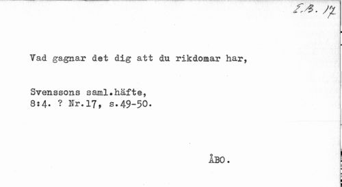 //// i //// i //// Vad gagnar det dig att du rikdomar har, //// Svenssons saml.häfte, 8:4* ? Nr.17, s.49-50. //// ÅBO. I ////