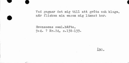 //// Vad gagnar det mig till att gråta och klaga, ^^ när flickan min ensam mig lämnat har. //// Svenssons saml.häfte, //// 9:4* ? Nr.24, s.138-139* //// ÅBO. //// % ////