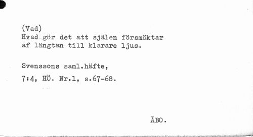 //// (Tad) //// Hvad gör det att själen försmäktar af längtan till klarare ljus. //// Svenssons saml.häfte, //// 7*4* HÖ. Nr.l, s.67-68. //// •» » .* //// ÅBO. //// r» //// -- v i- .. a' ¦ - _—•__- - ___.^Jl.l... . m-^ra ... ////