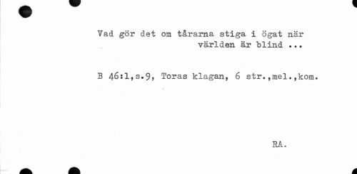 //// Vad gör det om tårarna stiga i ögat när //// världen är blind ... //// B 46:1, s.9> "Toras klagan, 6 str.,mel.,kom. //// RA. //// i ////