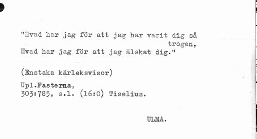 //// r i //// ¦ //// "livad har jag för att jag har varit dig så //// trogen, //// Hvad har jag för att jag älskat dig.tf //// •u //// (Enstaka kärleksvisor) //// i //// Upl.Fasterna, //// 303:785, s.l. (l6:0) Tiselius. //// ULMA. ////