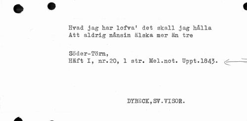 //// v -• - - ... . - -. — //// Hvad jag har lofva1 det skall jag hålla Att aldrig nånsin älska mer än tre //// Söder-Törn, //// Haft I, nr.20, 1 str. Mel.not. Uppt.1843* <r-^ //// DYBECK, SV. VISOR. ////