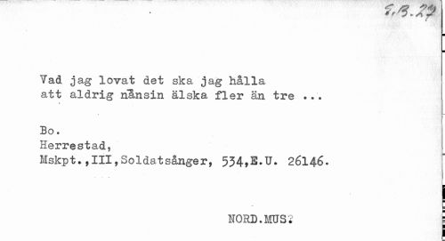 //// u //// m //// Vad ja g lovat det ska jag hålla //// att aldrig nånsin älska fler än tre ... //// Bo. //// Herrestad, //// Mskpt.,III,Soldatsånger, 534»E.U. 26146. //// NORD.MUS i j ////