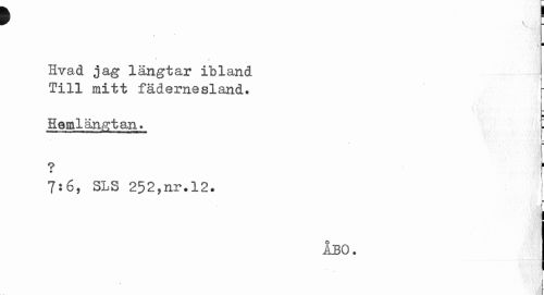 //// f l //// / //// ¦ //// Hvad jag längtar ibland Till mitt fädernesland. //// ¦ //// Hemlängtan. ¦ //// l. //// ? //// 7:6, SLS 252,nr.12. //// ÅBO. //// i //// i //// 1 ////