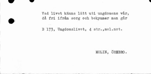 //// "Vad livet känns lätt uti ungdomens vår, ^^ då fri ifrån sorg och bekymmer man går //// B 175, Ungdomslivet, 4 str.,mel.not. //// MOLIN, örebeo• //// . • C ' .ItfL ////