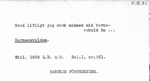 //// I //// ...I //// Hvad lif ligt jag dock minnes min barnaoskuld än ... //// Barnaoskulden. //// ¦ //// ¦ //// Wikl. 1868 Q.D. 4.9. Del.I, nr.261. //// ¦ //// RA1CK3H FÖRTECKNING. ! ////
