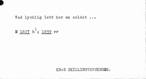 //// ^ [ //// i //// I j //// I //// f //// i //// Vad lycklig lott har en soldat ?.» //// i : //// I i //// E 1827 h1; 1859 rr //// KBjS SKILLINGTRYCKSREG. ////